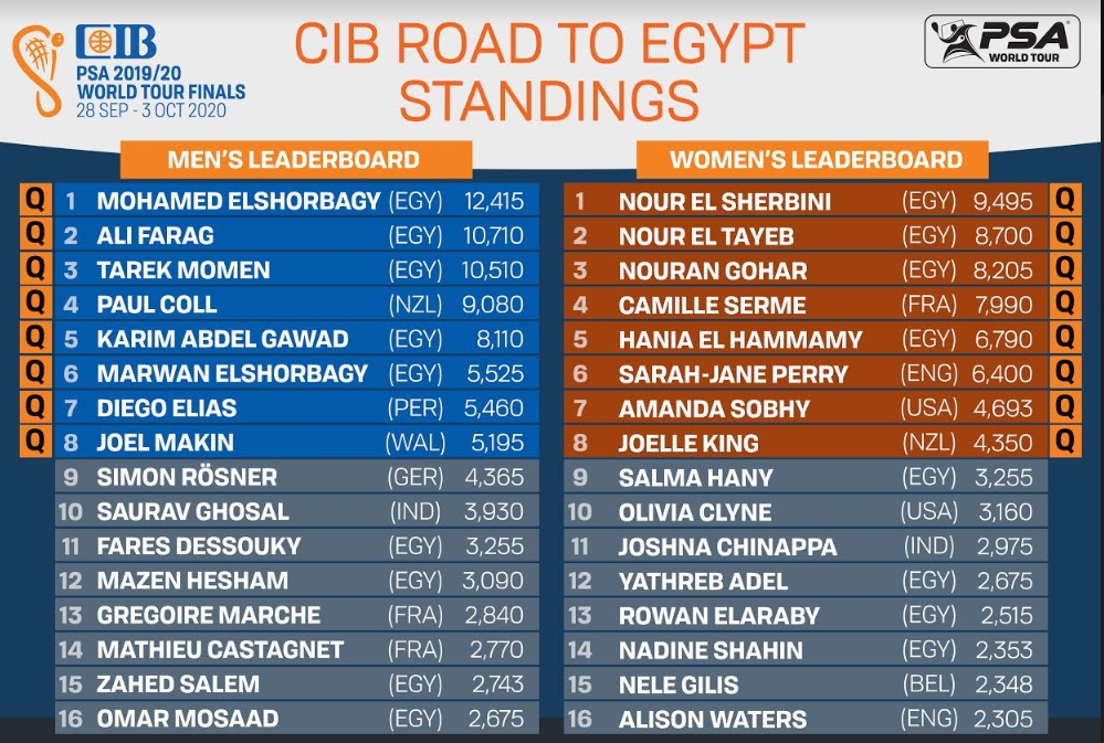 The CIB PSA World Tour Finals is then planned to take place between September 28 – October 3 in Cairo, Egypt, with entries being made up of the current top eight players on the CIB World Tour Finals Leaderboard.