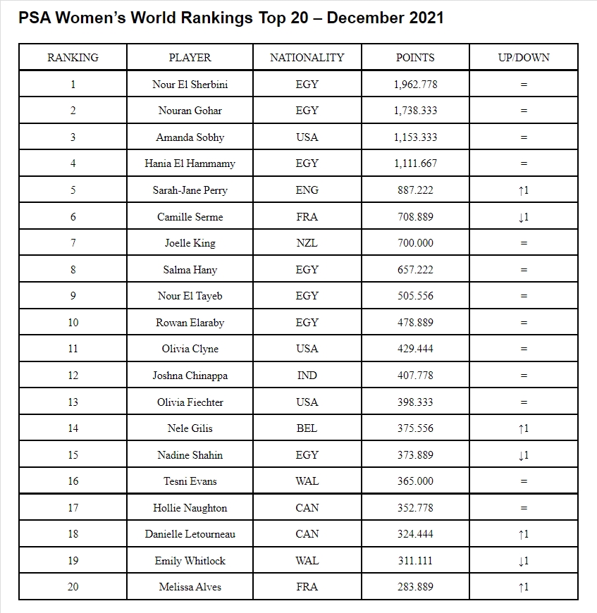 CIB Salma Hany (No.8), CIB Nour El Tayeb (No.9) and CIB Rowan Elaraby hold onto their positions in the top 10, with Nadine Shahin losing one place to Belgium Nele Gilis to No15.