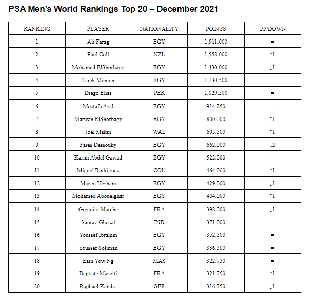 CIB Marwan ElShorbagy rises a place to #7 but CIB Fares Dessouky drops two spots to #9 – he is still injured – while CIB Karim Abdel Gawad rounds off the top 10.
