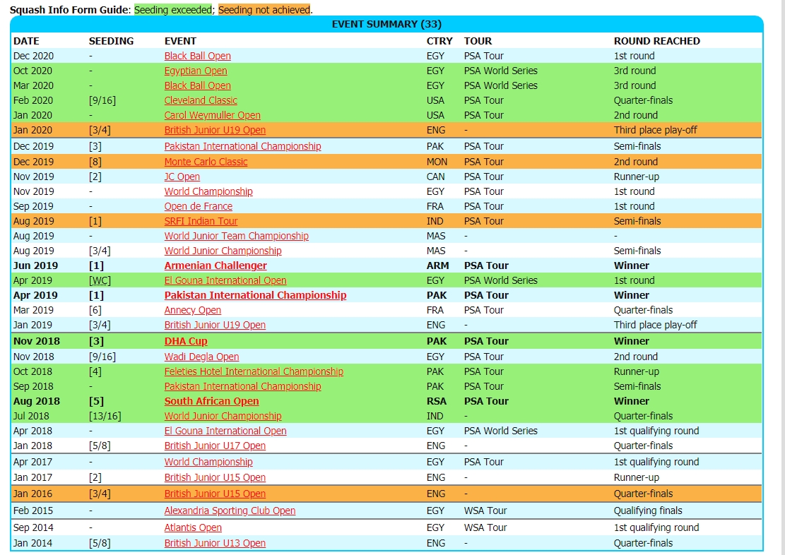 She had a few interesting matches against top players in recent months, forcing them to fight for 5 games, even making a few come backs from two love down that delighted the Egyptian crowds in Blackball (against Joelle King in particular).