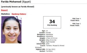 “Farida is one of Egyptian top young players that started to make her mark in the PSA Tour.