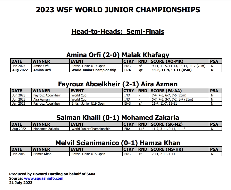 [3/4] Aira Azman (Mas) 3-0 [2] Fayrouz Aboelkheir 12-10, 11-7, 11-8[3/4] Mohamed Zakariah 3-0 [5/8] Salman Khalil 11-7, 11-6, 11-6