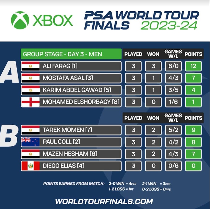 [1] Ali Farag 3-0 [3] Mostafa Asal 11-5, 5-2 retired (17m)